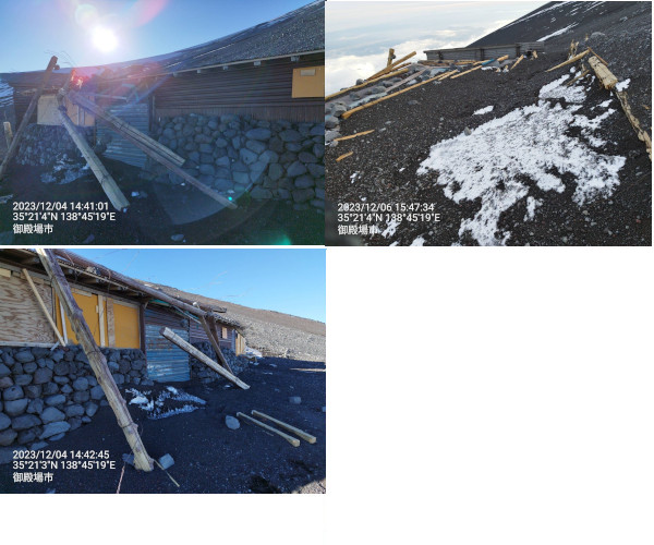 | 土石流 2023年12月、フジサクヤさんから土石流で屋根を大きく破損し小屋の半分が砂礫に埋もれた半蔵坊の写真が送られてきました やっと長い眠りから覚めたのに、、、またも半蔵坊に厳しい試練が発生しました 春になり雪が溶けるまで何もできません、何とか冬の富士山の厳しい自然環境を乗り切って欲しい。。。 |