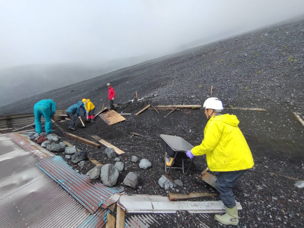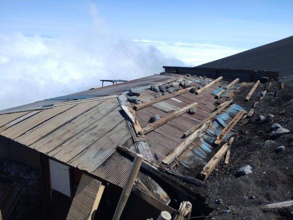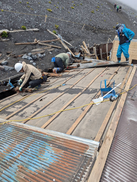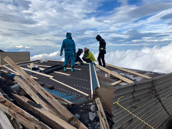 | 天空での屋根修理 眼下には雲海と山中湖、頭上には富士山頂、夜は夜景と天の川 雄大な景色を眺める暇もなく、富士山新6合目では屋根の修理が続いています | |