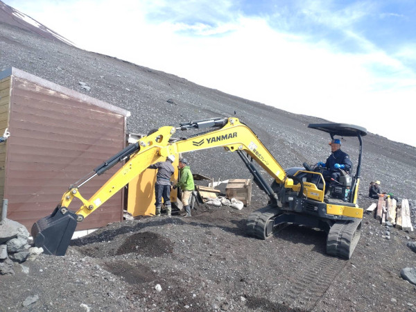 | ユンボ 山小屋の周囲の砂礫の除去から重量物の運搬まで、小屋開けにはクローラーやユンボが大活躍です 小屋番は大型特殊免許に加え、不整地走行、パワーショベルの免許を取得しています | |